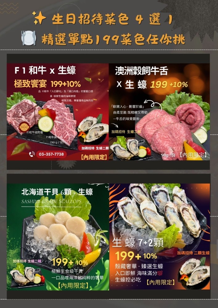 【老饕加價購一F1和牛 +生蠔】 199 + 10 %「一口知境界」 F1和牛,專屬懂得品味的你。 🥩好康再加碼🦪生蠔🦪兩顆